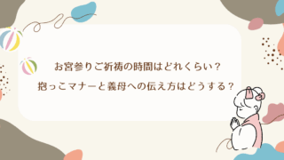 ベビーおでかけ・あそび お宮参りご祈祷の時間はどれくらい?抱っこマナーと義母への伝え方はどうする? 「お宮参りのご祈祷って、どれくらい時間がかかるの?」「赤ちゃんは誰が抱っこするべき?」——初めての行事となると、そんなちょっとしたことでも気になりますよね。特に、赤ちゃん連れでの外出は準備も多く、時間の見通しが立たないと不安になるものです。... 2025.09.27 ベビーおでかけ・あそび
